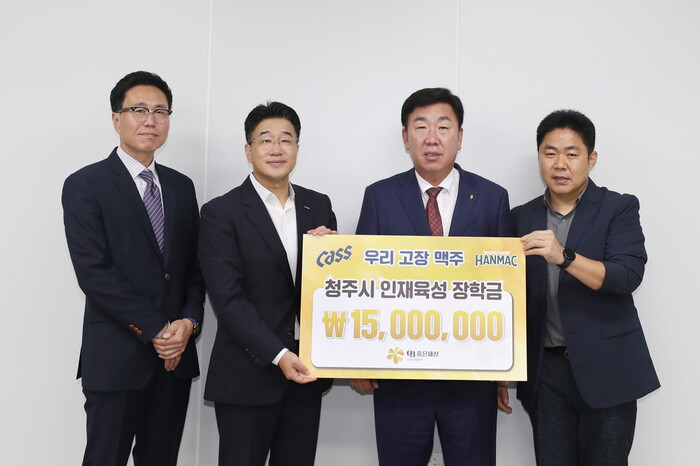 | ▲ 오비맥주가 자사 대표 브랜드 ‘카스’와 ‘한맥’ 생산 공장이 위치한 청주시에 지역인재 육성 장학금 1500만원을 기탁했다 (사진=오비맥주 제공) |