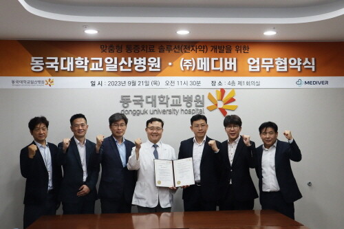 | ▲ 동국대학교일산병원은 희귀.난치성 통증치료를 위한 생체신호기반 맞춤형 솔루션 디바이스(전자약) 개발을 위해 지난 21일 통증치료 전자약 플랫폼기업 메디버와 공동연구개발을 위한 MOU를 체결했다. (사진=동국대학교일산병원 제공) |