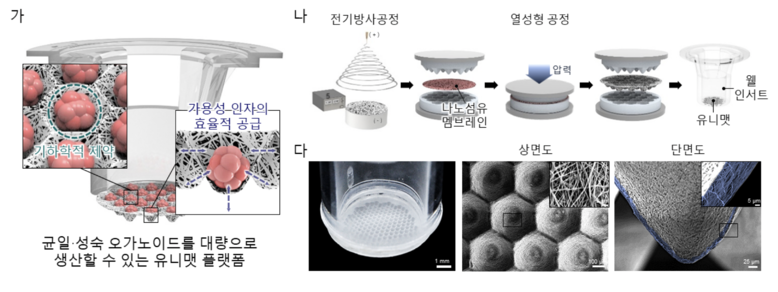 이러한 문제를 해결하기 위해 공동 연구팀은 성숙한 오가노이드를 대량으로 생산할 수 있는 플랫폼인 '유니맷'을 개발했다. 이 플랫폼은 머리카락의 1/200 크기인 매우 가는 나노섬유로 3차원 멤브레인을 구현한 것으로, 오가노이드가 균일하게 형성될 수 있는 구조적 환경을 제공함과 동시에 물질 투과성을 통해 오가노이드의 분화와 성숙에 필요한 영양분과 분화 인자를 효율적으로 공급하도록 설계됐다.
