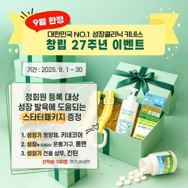 1999년부터 성장 분야 연구와 임상 경험을 축적해온 키네스는 9월 한 달간 정회원 등록자 중 선착순 100명에게 ‘스타터패키지’를 증정한다.