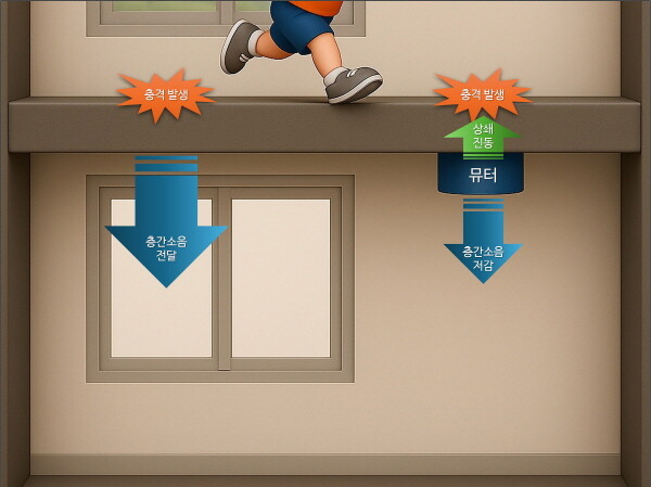 | ▲ 롯데건설과 세이렌어쿠스틱스가 공동 개발한 능동형 진동제어(Active Vibration Control) 기술을 활용한 층간소음 저감장치가 상용화 단계에 진입했다. ‘뮤터’ 적용 전 층간소음(왼쪽) 및 ‘뮤터’ 적용 후 층간소음(오른쪽) 원리 비교 (사진= 롯데건설 제공) |