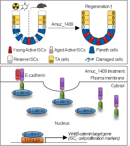 연구팀은 이러한 Amuc_1409에 의한 장 건강 개선 효과는 Amuc_1409가 세포와 세포를 이어주는 분자인 E-cadherin과 결합해 상호작용하며 장 줄기세포의 재생 신호전달 체계를 활성화하기 때문이라는 기전도 규명했다.