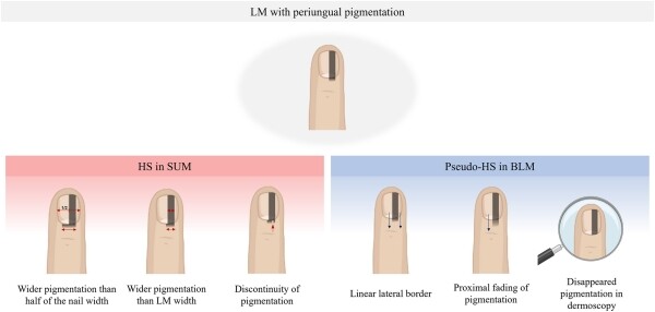 악성 흑색종에 의한 허친슨 징후는 ▲손발톱 너비의 절반을 넘는 넓은 색소침착 ▲기존 흑색선조보다 넓은 색소침착 ▲불연속적인 색소침착이라는 특징을 보였다. 반면 양성 질환의 가성 허친슨 징후는 ▲직선 형태의 측면 경계 ▲근위부로 갈수록 색이 옅어짐 ▲피부확대경(Dermoscopy) 관찰 시 사라지는 색소침착이라는 상이한 패턴을 나타냈다.