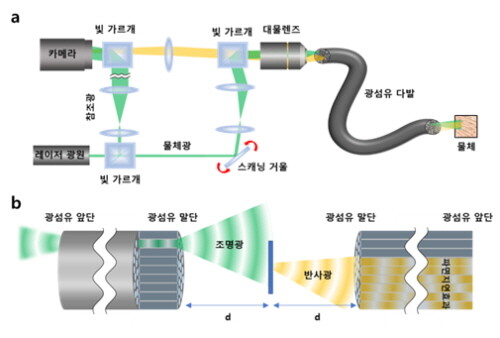 이에 연구진은 광섬유 다발 말단 부분에 렌즈나 어떠한 장비도 부착하지 않고도 고해상도로 관찰 가능한 아주 얇은 내시경을 개발해 기존 광섬유 내시경의 한계를 극복했다.