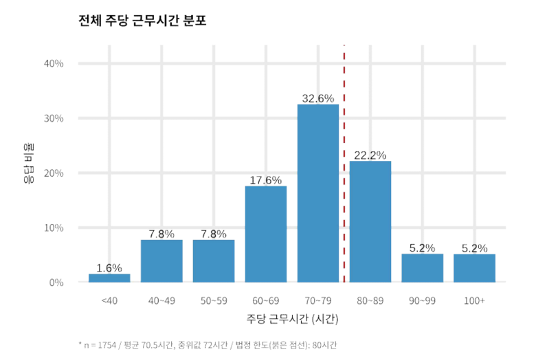 조사에 따르면 전공의의 주당 평균 실제 근무시간은 70.5시간으로 집계됐다. 2022년(77.7시간) 대비 줄었지만 여전히 높은 수준이다. 특히 응답자의 27.1%는 최근 3개월간 4주 평균 주 80시간을 초과해 근무했다고 답했다. 인턴과 저년차 레지던트일수록 초과 근무 비율이 높았다.