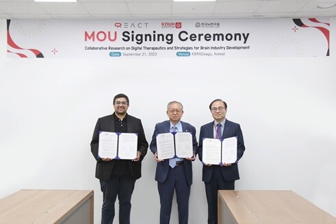 이날 협약식에는 박성식 칠곡경북대학교병원장, 서판길 한국뇌연구원장, REACT Neuro CEO Shaun Patel 등 각 기관 관계자 15명이 참석했다.