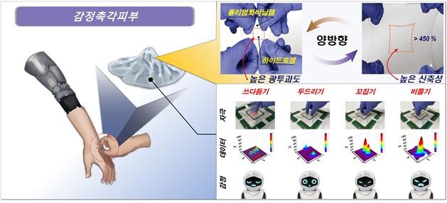 한국연구재단은 한국기술교육대학교 김상연 교수 연구팀이 금오공과대학교 최동수 교수(제1저자), 포항공과대학교 최승문 교수와 협력해 로봇과 같은 전자장치가 사람과 촉각적으로 감정 교류를 할 수 있는 ‘감정촉각피부’를 개발했다고 21일 밝혔다.