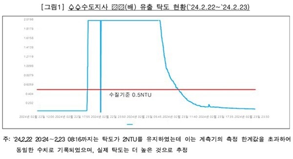 하지만 감사실의 조사 결과, 당시 KRM 위기 등록시간 보다 약 9시간 이전인 2월22일 20시17분부터 탁도가 상승해 수돗물 수질 기준(0.5NTU)을 초과했으며 KRM 위기 종료 후 약 3시간 이후인 2월23일 11시14분까지 수돗물 수질 기준을 초과한 탁도가 측정됐다.