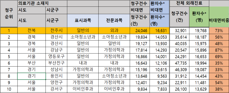 국회 교육위원회 소속 김윤 더불어민주당 의원이 건강보험심사평가원 자료를 분석한 결과, 전주 소재 한 의원의 지난해 비대면 진료 청구 건수는 총 2만4046건으로 전국 의원급 의료기관 가운데 가장 많았다. 전체 진료(3만2901건)의 73%가 비대면으로 이뤄진 셈이다.