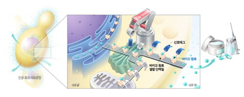 | ▲ 바이오원료를 생산하는 인공 세포공장(좌, 효모) 속의 특정 바이오원료를 세포 밖으로 배송할 수 있는 시스템 (사진=한국화학연구원 제공) |