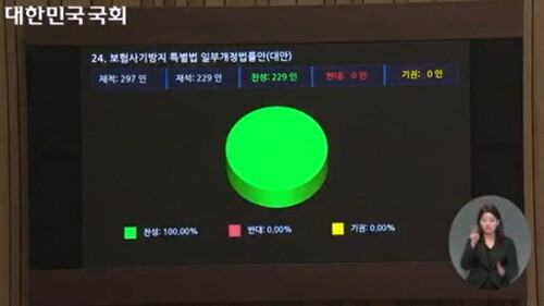 보험사기방지특별법 개정안은 25일 국회 본회의에서 진행된 투표에서 재석 의원 229명 중 찬성 229표를 얻어 만장일치로 통과됐다.