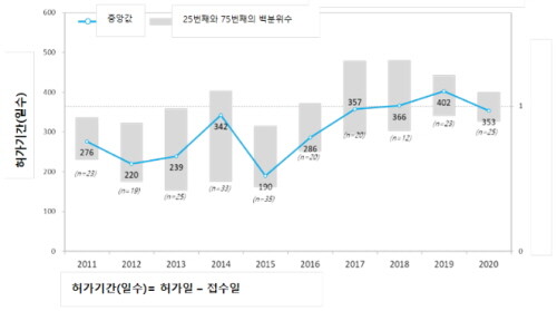 조사연구 결과에 따르면, 조사 기간 동안 허가·심사에 소요되는 기간은 평균 313.7일로 2015년 이후 꾸준히 증가하는 추세이며, 지난 2017년까지의 조사 결과(평균 299.7일)와 비교하여 2주 정도 늘어난 것으로 조사됐다.