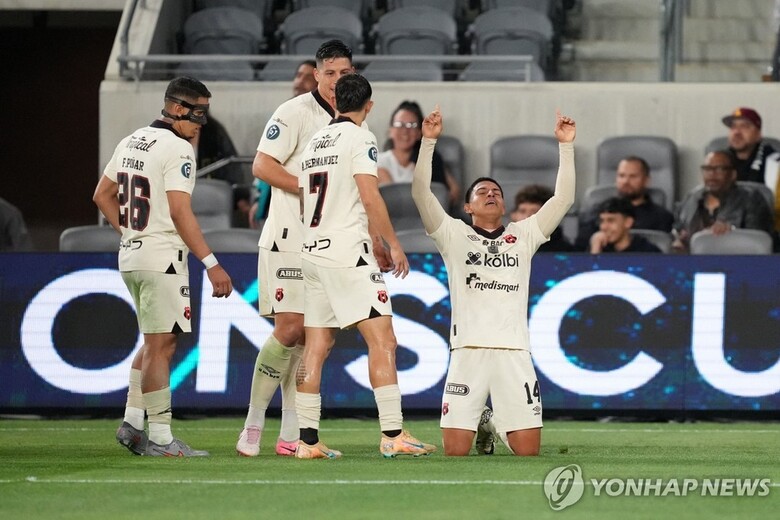| ▲ 골 세리머니 하는 알라후엘렌세 선수들 (사진=Kirby Lee-Imagn Images-연합뉴스) |
