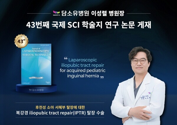 해당 논문은 미국의 학술 전문 출판사 Marry Ann Liebert가 발행하는 Journal of Laparoendoscopic & Advanced Surgical Technique에 ‘Laparoscopic iliopubic tract repair for acquired pediatric inguinal hernia’라는 제목으로 실렸으며, 담소유병원이 발표한 복강경 탈장 분야 28번째 SCI 논문이다.