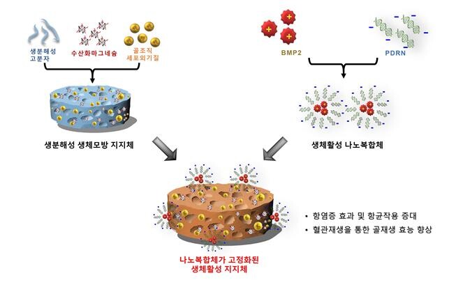 | ▲ 골재생 및 혈관재생능이 우수한 나노복합체가 포함된 생분해성 생체활성 지지체 제조 모식도 (사진=한국연구재단 제공) |