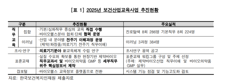보건복지부에 따르면 보건산업교육사업의 핵심적인 사업목표는 ‘전문인력의 양성’과 ‘현장의견을반영한 교육프로그램 개발’이다. 그러나 인재원이 이를 위해 추진하고 있는 직무교육의대상은 대부분 대학생이거나 취업준비생이어서 바이오헬스산업 전문인력을 양성한다는 사업의 목적과는 차이가 있다고 지적했다.