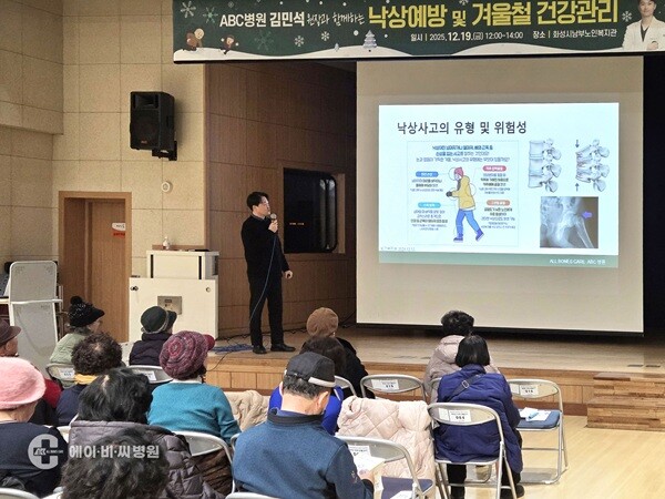[mdtoday=최민석 기자] ABC병원 김민석 센터장이 지난 12월 19일 화성시남부노인복지관에서 어르신들을 위한 ‘낙상 예방 및 겨울철 건강관리’ 강의를 진행했다. 이번 강의는 어르신들이 일상에서 꼭 알아둘 필요가 있는 건강 관리 방법을 소개하고 낙상 예방을 위한 실질적인 정보를 제공하기 위해 마련됐다.