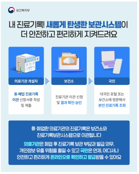 [mdtoday=김미경 기자] 보건복지부와 한국보건의료정보원이 다니던 병원이 문을 닫아도 국민이 자신의 진료기록을 보다 편하게 확인할 수 있도록 휴·폐업 의료기관 진료기록보관시스템 개선을 추진한다.
