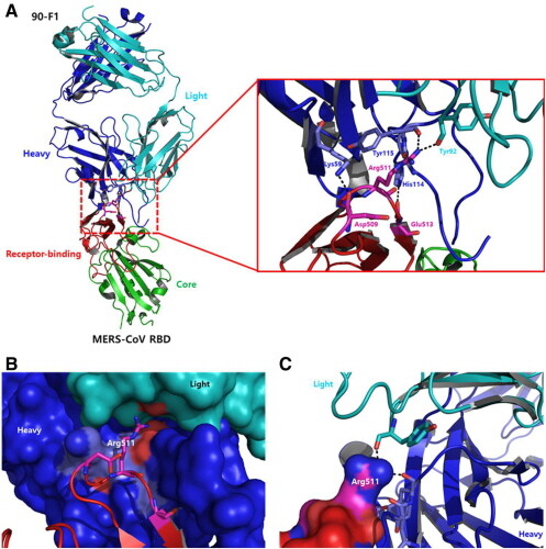 | ▲ 메르스 바이러스 치료 단클론항체(KNIH90-F1)와 MERS-CoV RBD 항원의 결합자리. (사진=케이메디허브 제공) |