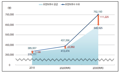보건복지부 요양보험운영과가 발표한 국내 요양보호사 자격증 취득 인원은 해마다 증가하고 있는 추세이고 2020년에 1,935,229명이 자격증을 취득했다. 그러나 국내 노인장기요양인력 수급 추계 연구 논문 등에 따르면 2030년에는 75만2150명의 요양인력의 수급이 요구되고, 공급과 수급의 격차는 더욱 현저히 벌어질 것이고 심화될 것으로 전망된다.