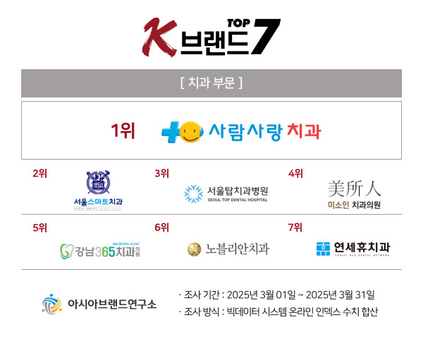 [mdtoday=신현정 기자] 아시아브랜드연구소는 최근 발표에서 'K-브랜드 톱7' 치과 부문에서 사람사랑치과의원이 1위를 차지했다고 밝혔다.