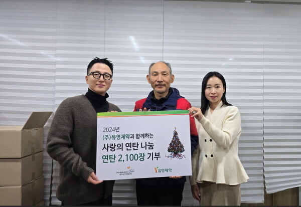 | ▲ 왼쪽부터 유영제약 김건우 팀장, 사랑의연탄나눔운동 원기준 사무총장, 유영제약 김혜영 책임 (사진=유영제약 제공) |