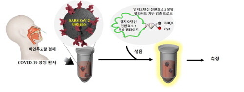 | ▲ ACE2 모방 펩타이드 기반 나노 프로브를 통한 코로나19 양성 환자의 개략적 판별 과정 (사진=한국생명공학연구원 제공) |