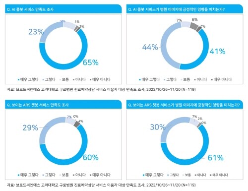 | ▲ 고려대학교 구로병원 AI 콜봇 서비스 만족도 조사 결과 (자료=브로드씨엔에스 제공) |