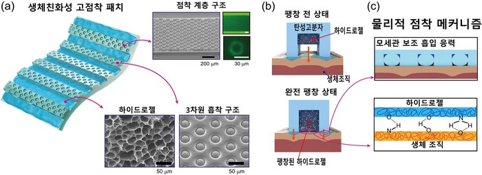 연구팀은 개구리 발바닥을 본뜬 미세구조기반 탄성고분자와 하이드로젤(하이브리드 접착소재)의 표면접착력 및 정전기력과의 열역학적 평형 메커니즘을 최초로 규명하고 이를 전자패치에 적용했다.