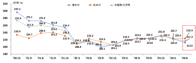 같은 기간 손해보험사는 경과 조치 적용 후 기준 223.9%로 0.8%p 감소, 적용 전 기준 215.6%로 0.5%p 감소하는데 그쳤다.