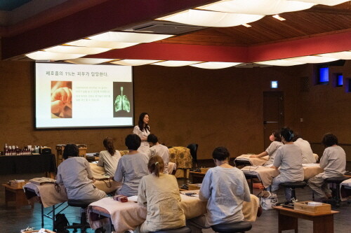 충주 깊은 산속 옹달샘에서 진행됐으며, 말기암 환우의 힐링을 위한 아로마테라피 힐러 양성 과정으로 아로마테라피 이론, 힐링을 위한 전신 관리 상호 실습과 노케미 에스테틱 방법 등을 배웠다.