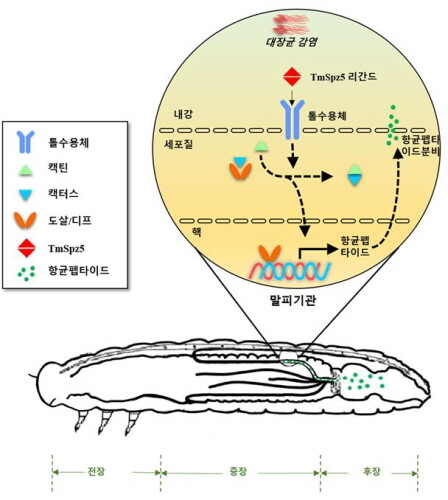 전남대 한연수 교수 연구팀은 유전자 침묵 기술을 활용해 톨 수용체의 리간드인 ‘Spätzle5’ 단백질이 사람의 신장과 유사한 기능을 하는 말피기관에서 여러 종류의 항균펩타이드 생산을 조절하며, 또 이를 후장(hindgut)으로 이동시켜 숙주의 항세균 면역을 증강시키는 사실을 규명했다고 24일 밝혔다.