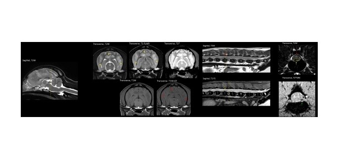 MRI는 수분 함량이 높은 연부조직을 정밀하게 관찰하는 데 특화된 검사다. 뇌수두증, 뇌수막염, 뇌종양, 원인 불명의 발작과 같은 뇌·신경계 질환, 디스크 탈출증(IVDD), 척수연화증, 척수종양 등 척추 질환에서는 MRI가 사실상 필수적인 진단 도구로 활용된다.