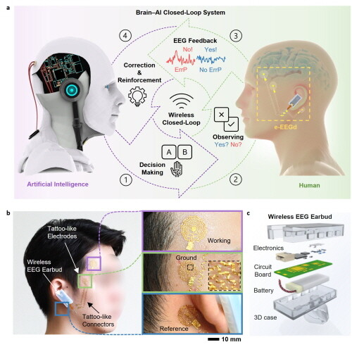 | ▲ 뇌-인공지능 폐쇄 루프 제어 시스템의 모식도와 연구팀에서 제작한 문신 전자 장치 기반 무선 웨어러블 뇌파 측정 디바이스 (사진=한국연구재단 제공) |