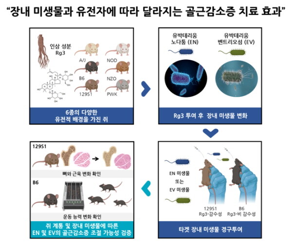 연구팀은 6종의 서로 다른 유전형질을 가진 실험용 쥐를 활용해 Rg3가 골근감소증에 미치는 영향이 유전자에 따라 어떻게 달라지는지 그리고 장내 미생물이 어떤 역할을 하는지를 분석했다.