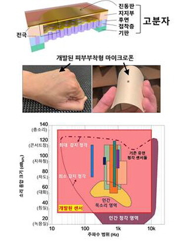 | ▲ 고분자 기반 피부부착형 마이크로폰의 모식도, 부착 사진, 감지 성능 비교 그래프 (사진=포스텍 제공) |