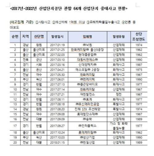 | ▲ 2017년~2022년 산업단지공단 관할 64개 산업단지 중대사고 현황(사진=정의당 강은미 의원실 제공) |