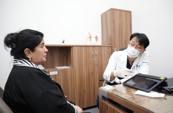| ▲ 인천힘찬종합병원 정형외과 최문기 부원장이 수술 전 오칠로바 자밀라 라흐마토브나 씨를 진료하고 있다. (사진=힘찬병원 제공) |