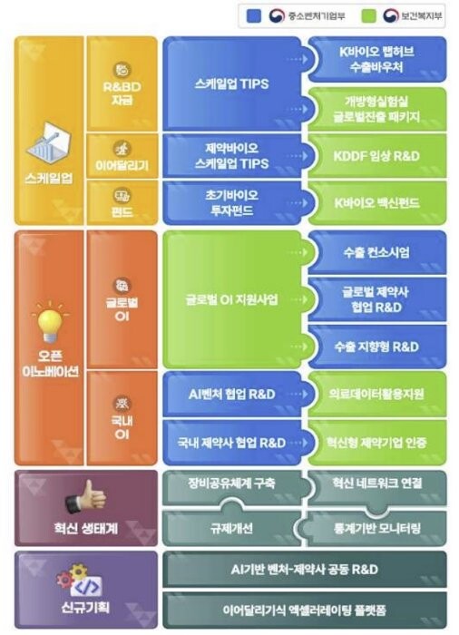 부처 합동으로 신규사업 기획도 추진된다. AI 활용 제약바이오벤처-제약사 공동 연구개발 사업을 신설해 신약개발 초기 단계 협업을 촉진하고, ‘K-바이오 기술사업화 함께달리기’ 프로그램을 신규로 마련해 기술개발 전략 수립부터 인프라 활용, 글로벌 진출까지 통합 지원할 예정이다.
