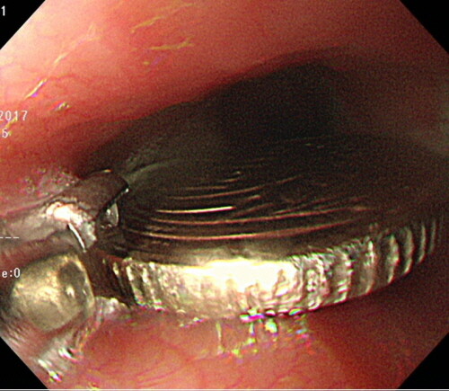 | ▲ 하부 식도에서 내시경으로 제거 중인 동전 (사진=순천향대 부천병원 제공) |