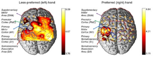 그 결과, 오른손 집게손가락에 자극을 주자 좌뇌가 주로 활성화됐지만, 왼손 집게손가락에 자극을 주자 좌뇌와 우뇌에 걸쳐 넓고 고른 활성화가 나타났다.