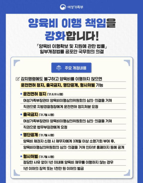 한편, 지난해 6월 '양육비 이행확보 및 지원에 관한 법률' 개정(2021년 6월10일 시행)으로, 감치명령 결정에도 불구하고 양육비 채무자가 양육비를 지급하지 않는 경우 지방경찰청장에게 운전면허 정지처분을 요청할 수 있는 근거를 마련한 바 있다.