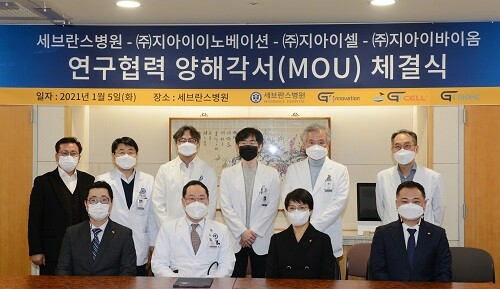 이날 오후 2시 세브란스병원에서 열린 협약식에는 고영준 지아이이노베이션 디스커버리부문장, 홍천표 지아이셀 대표, 양보기 지아이바이옴 대표, 하종원 세브란스병원장, 최재영 의과학연구처장, 정보영 연구부원장, 연구중심병원 육성R&D사업을 수행하고 있는 연세대 의대 이은직 교수, 박중원 교수, 김재우 교수 등 각 기관 관계자들이 참석했다.
