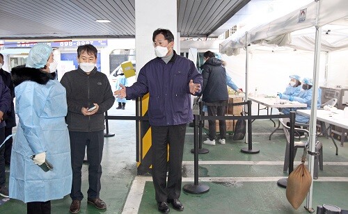 | ▲이창우 동작구청장이 임시 선별진료소를 방문해 방역활동요원들을 격려하는 모습 (사진=동작구 제공) |