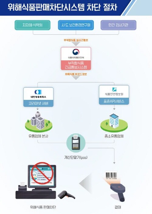 위해식품 판매차단 시스템은 지난 2009년부터 운영돼 온 위생점검과 수거‧검사를 통해 부적합 판명된 식품의 바코드 정보를 마트 등 판매업체의 계산대(POS)로 신속히 전송해, 바코드를 스캔하는 순간 해당 식품의 판매가 차단되는 시스템이다.