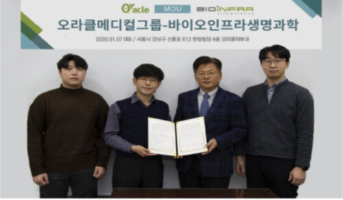 바이오인프라생명과학은 오라클메디컬그룹과 지난 7일 바이오인프라생명과학이 보유한 피부약물전달기술에 대한 공동 연구는 물론 상품의 개발과 유통 및 판매에 대해 포괄적으로 상호협력하기로 양해각서(MOU)를 체결했다고 8일 밝혔다.