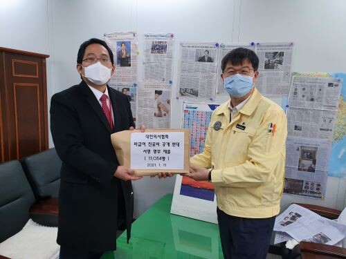 | ▲최대집 회장이 비급여 항목·가격 공개 반대 서명지를 전달하고 있다 (사진= 대한의사협회 제공) |