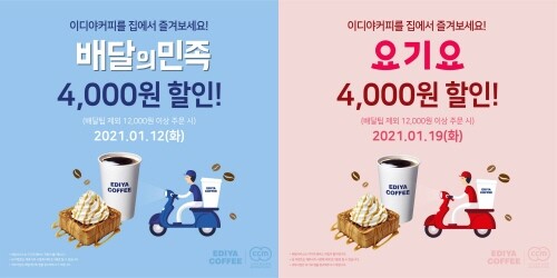 이디야커피가 배달서비스를 이용하는 고객들을 대상으로 12일과 오는 19일 배달의 민족과 요기요 배달 어플리케이션을 통해 주문 고객에게 4000원 할인 이벤트를 진행 한다고 밝혔다.