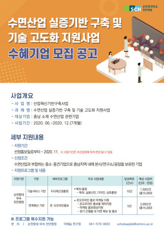 | ▲ 순천향대천안병원 수면산업실증센터가 11월까지 충남 소재 수면산업 관련 기업들을 대상으로 기술 고부가가치화 및 기업 역량강화를 지원할 수혜기업을 모집한다. 사진은 공고 포스터(사진=순천향대천안병원 제공) |