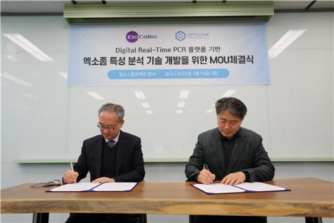 반도체 기반 바이오 분석 플랫폼 기업 옵토레인과 글로벌 4대 엑소좀 기업인 엑소코바이오는 양사 간 ‘디지털 실시간 PCR (Digital Real-time PCR) 플랫폼 기반 엑소좀 특성 분석 기술개발을 위한 업무협력 양해각서’(MOU)를 체결했다고 밝혔다.